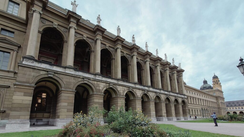 ヘラクレスザールは、ミュンヘン中心部のレジデンツ宮殿内にあります。 最寄り駅は地下鉄の「Odeonsplatz(オデオン広場)駅」で、そこから徒歩約5分。 入口は宮殿の北側・ホーフガルテン(Hofgarten)側にあり、緑豊かな公園沿いの道を進んだ先にあります。 緑が多く、サインも無いので「本当にここにあるの?」と不安になるかもしれませんが、建物の中央あたりにある扉を探して、入場しましょう。