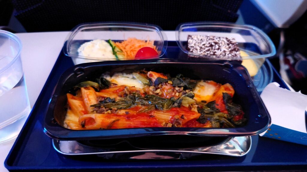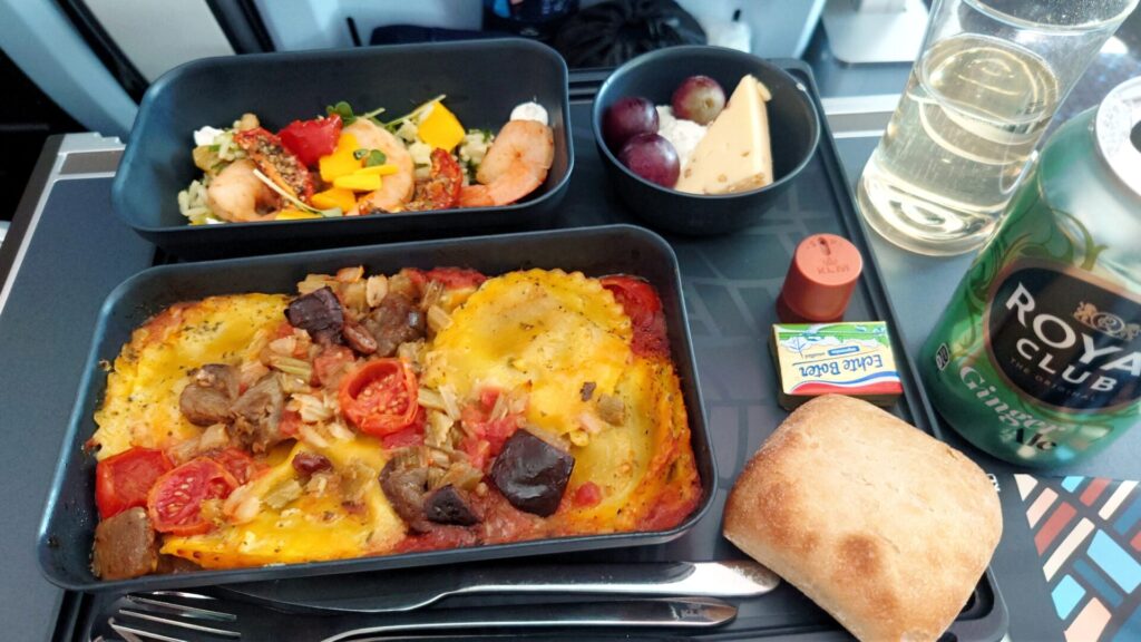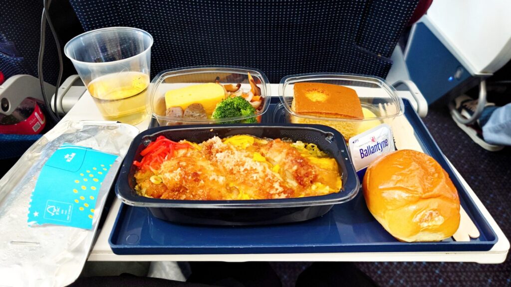プレミアムコンフォートでは、カトラリーが金属製で食器も少しグレードアップ。プレミアムコンフォートでは、ドリンクや軽食の追加サービスも積極的に声をかけてくれ、快適に過ごせました。