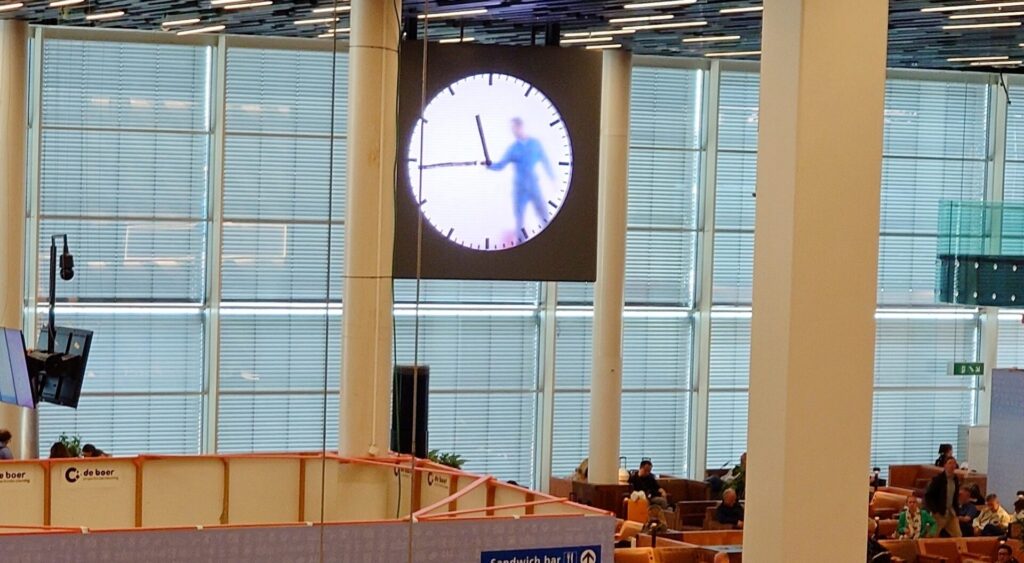 スキポール空港にある有名な時計「リアルタイム (REAL TIME)」は、国際線「第2ラウンジ」にあります。出国審査等を終えると、見えてきます。マーティン・バース (Maarten Baas)というオランダ人のデザイナーによる作品です。